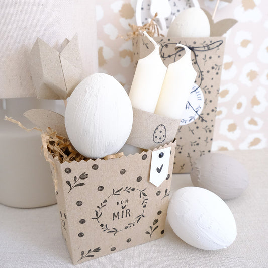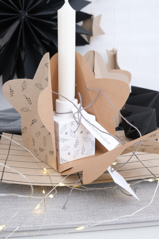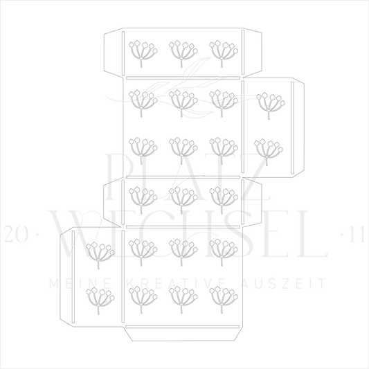 Die Schablonen legst du auf dein Lieblingspapier, zeichnest den Umriss nach und ziehst mit einem Embossingstift die Faltlinien. Nach dem ausschneiden kannst du die Verpackung ganz nach deinen Vorstellungen mit Stempeln und Schablonen gestalten.