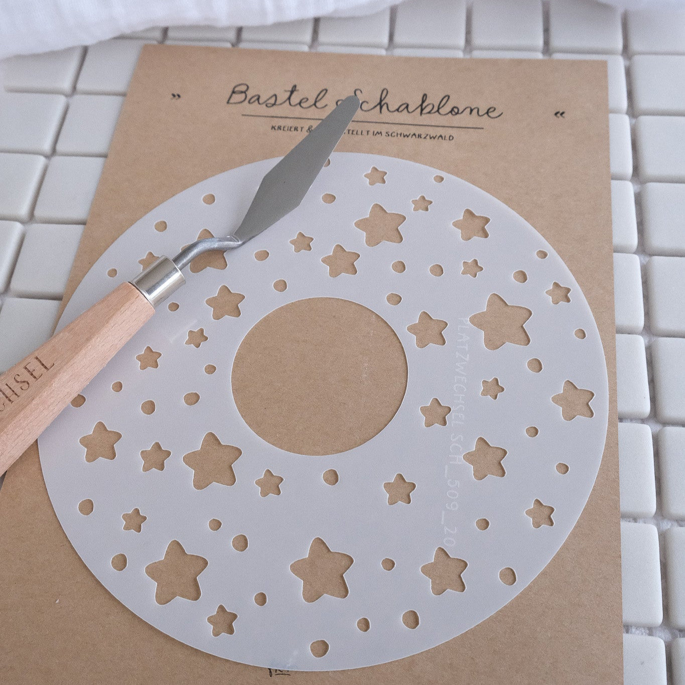 MERKMAL: Die Schablone hat eine Runde Form so kann sie zb. in gegossene Teller gelegt werden. Das Motiv überträgst du mit Hilfe von einer kleinen Farbspachtel und Strukturpaste.
