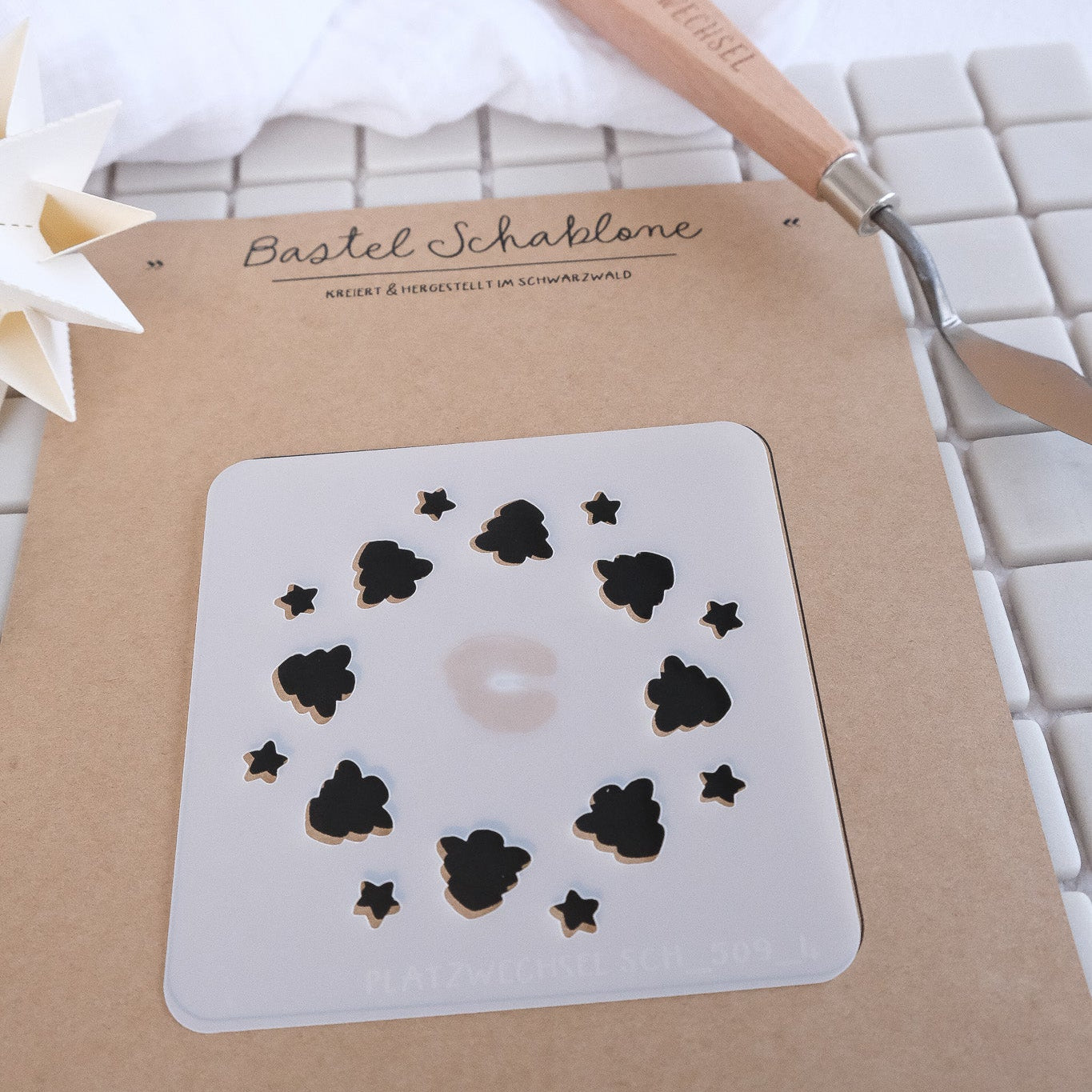 MERKMAL: Die Schablone hat eine runde Form. So kann sie zb. in gegossene Teller mit einem Durchmesser von 24cm oder 32cm gelegt werden. Das Motiv überträgst du mit Hilfe von einer kleinen Farbspachtel und Strukturpaste.