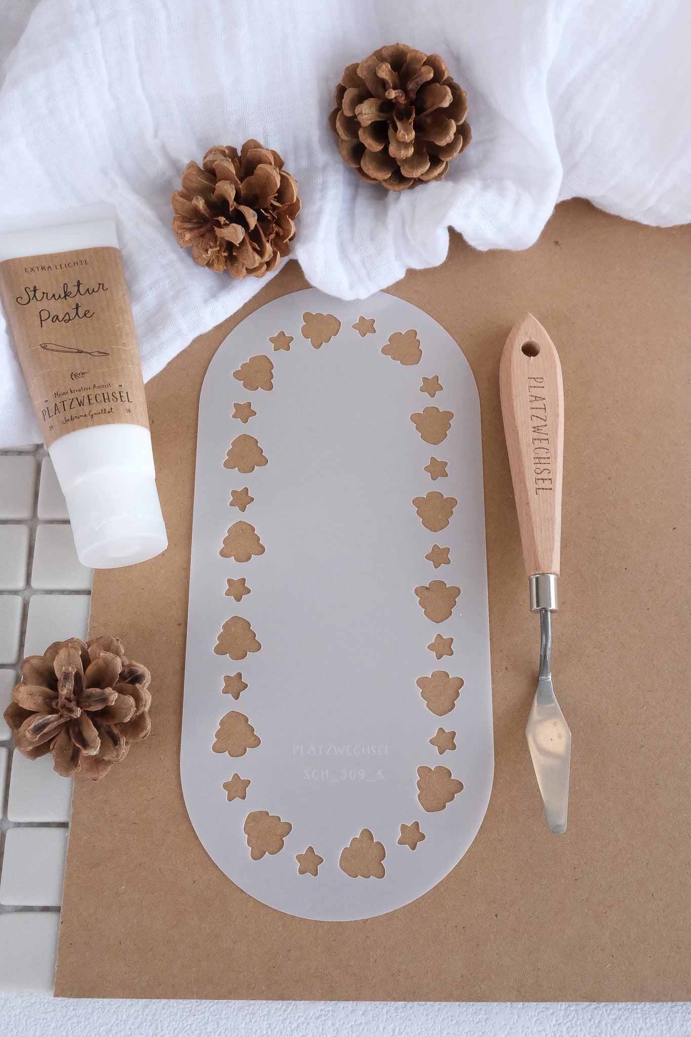 MERKMAL: Die Schablone hat eine Runde Form so kann sie zb. in gegossene Teller gelegt werden. Das Motiv überträgst du mit Hilfe von einer kleinen Farbspachtel und Strukturpaste.